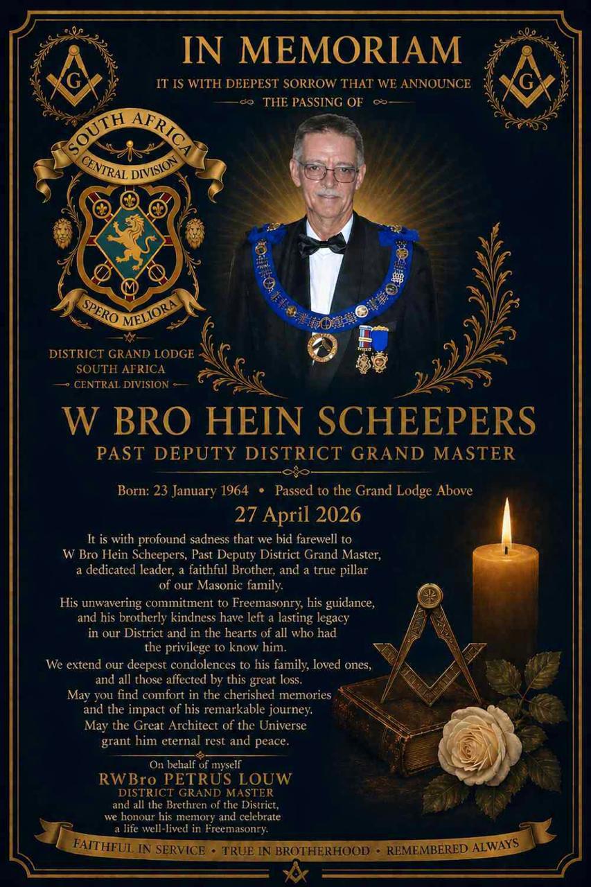 In this rising, the District Grand Master, Right Worshipful Brother Petrus Louw, extends his invitation to all brethren of the Central Division to attend the Mid Year AGM, hosted by Austral Lodge in Mafikeng.